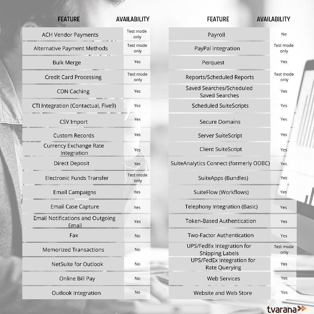 Development account: A development account comes with the same features and NetSuite-provisioned SuiteApps as your production account, but lacks the customizations or production data. A development account is used specifically for testing customizations and integrations and can be populated with data for this purpose. It can be shared with external partners for development without having to divulge sensitive company information.